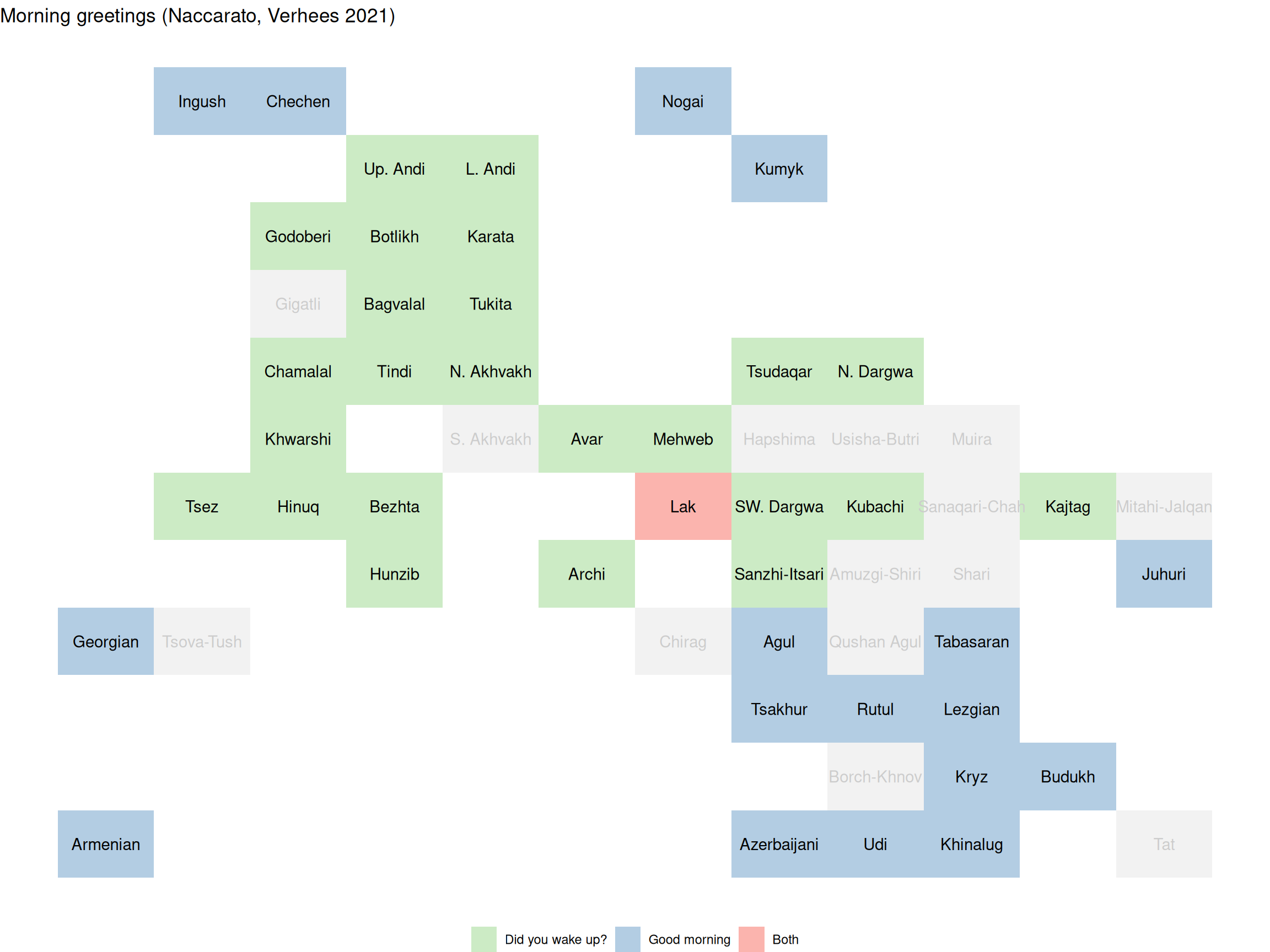 morning_greetingscontains values from the “Morning Greetings” chapter (Naccarato, Verhees 2021) from the Typological Atlas of the Languages of Daghestan. The languages of Daghestan can be classified into three groups according to whether they feature morning greetings including questions about the night’s rest (valueDid you wake up?), based on the combination of concepts like “morning” and “good” (valueGood morning), and both strategies (valueBoth).consonant_inventory_sizecontains consonant inventory sizes based on “Phonology” chapter (Moroz 2021) from the Typological Atlas of the Languages of Daghestan.